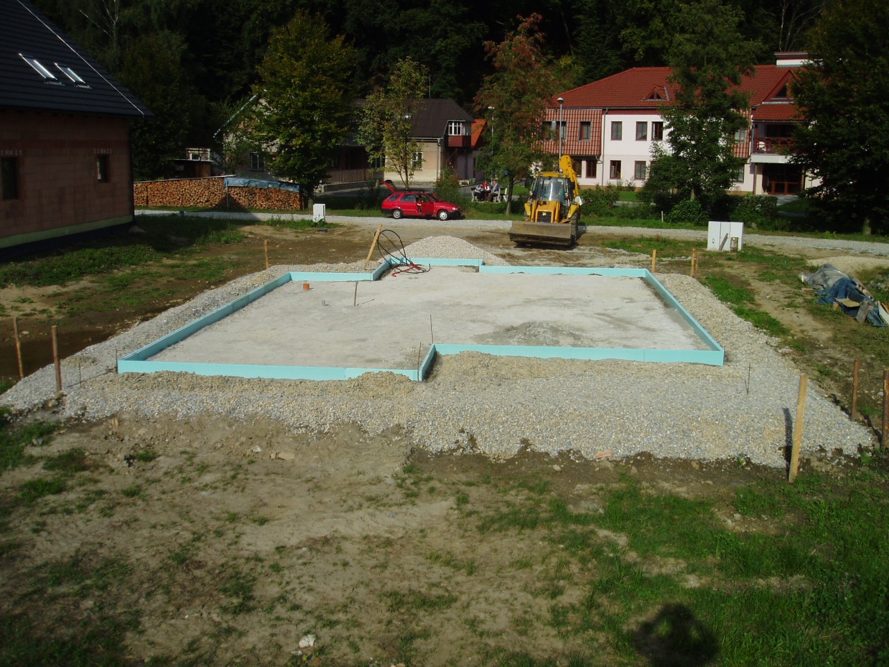 | Štěrkový polštář s tepelně izolačním ztraceným bedněním základové desky provedeným z extrudovaného polystyrenu. |