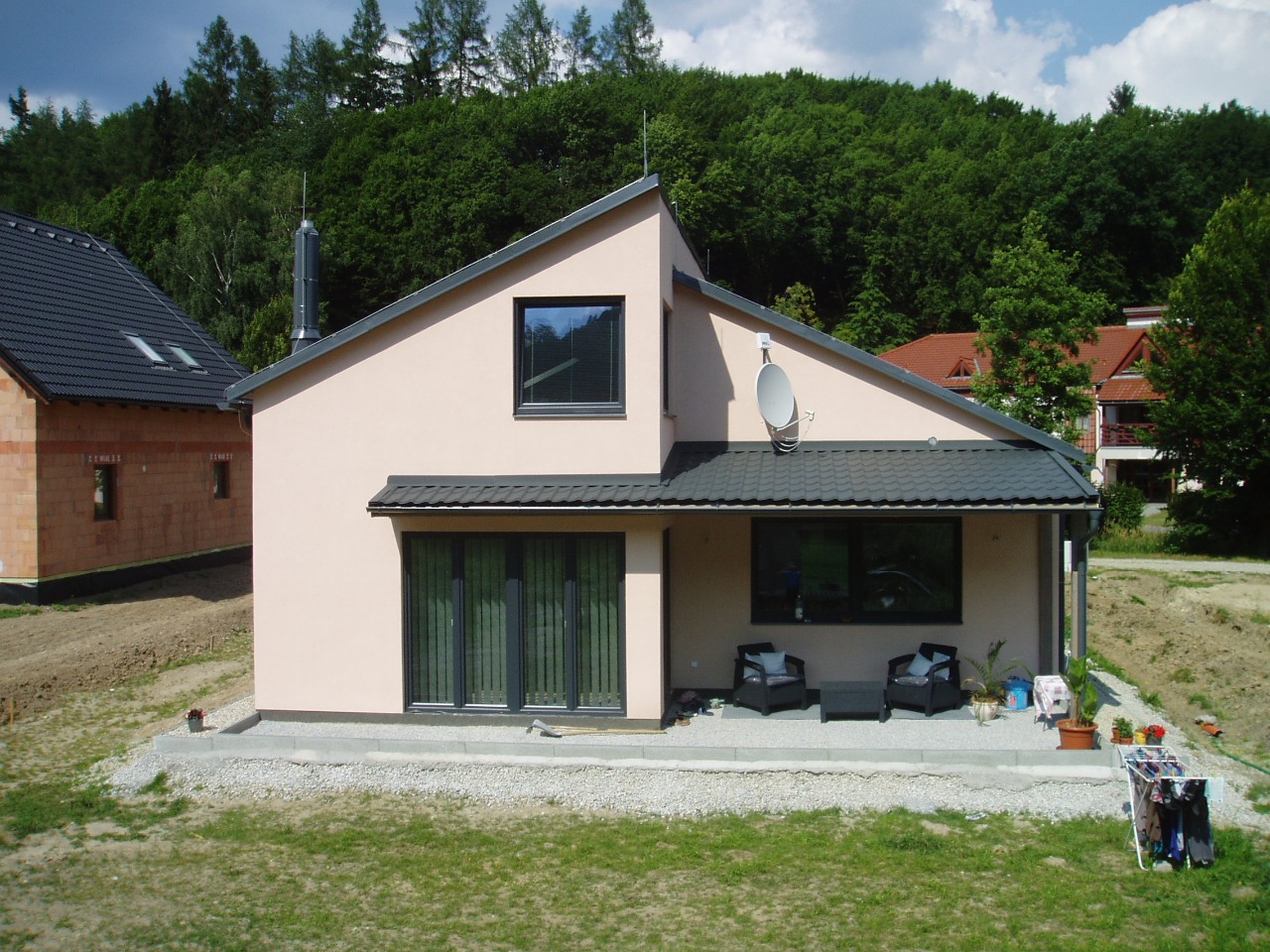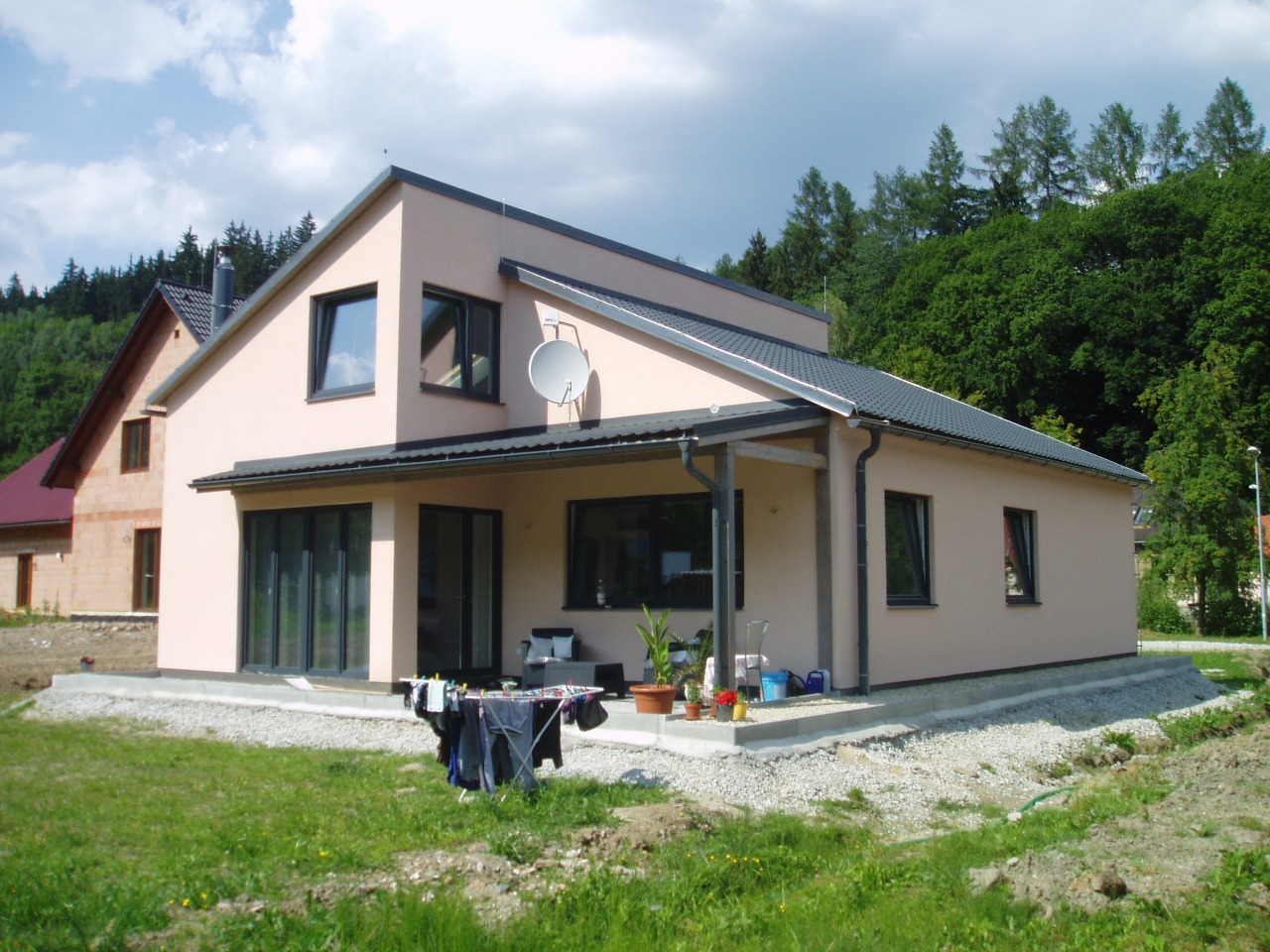 | Po dokončení obvodového pláště je umožněno temperování objektu a mohou pokračovat vnitřní práce. | S příchodem jara je dokončena fasáda domu a zakrytí terasy. |