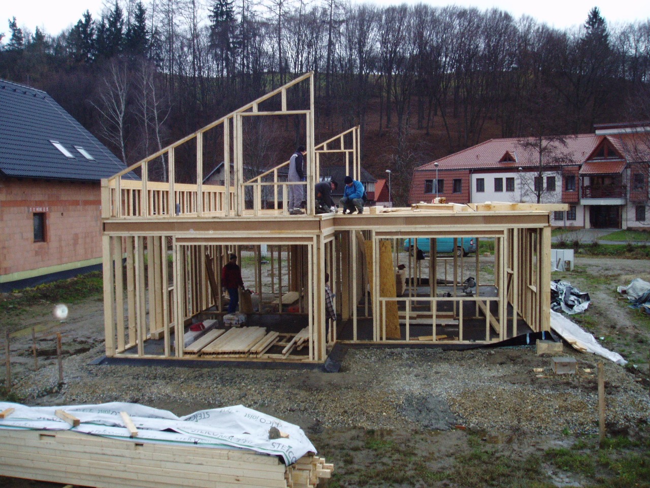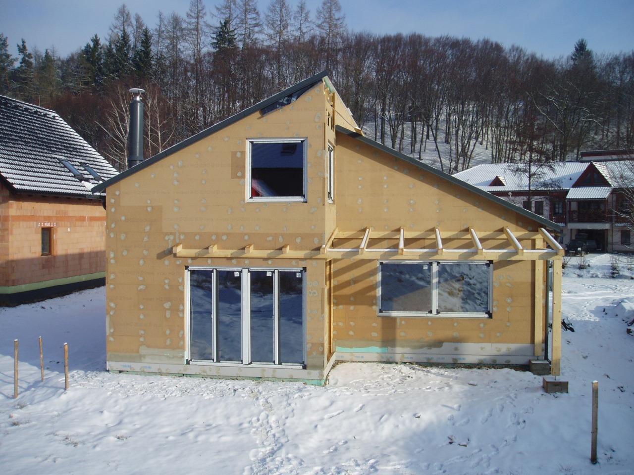 Po dokončení dřevěné kostry se provádí obvodový plášť chránící stavbu proti klimatickým vlivům - střecha, okna a opláštění stěn. | |